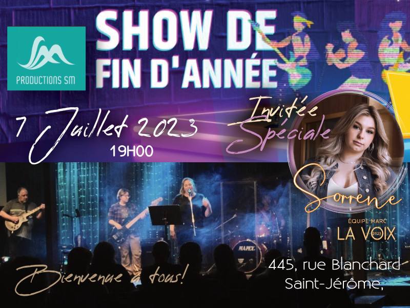 Productions SM, enterprise de professionnels du domaine de la musique de la région, présentera son show de fin d’année. J’y participerai en tant qu’Invitée Spéciale. Pour la dernière partie du spectacle, j’aurai le privilège d’interpréter plusieurs chansons, accompagnées sur scène de plusieurs musiciens émérites et passionnés. Pour plus d’informations et pour te procurer des billets: info.prod.sm@gmail.com 😉❤️