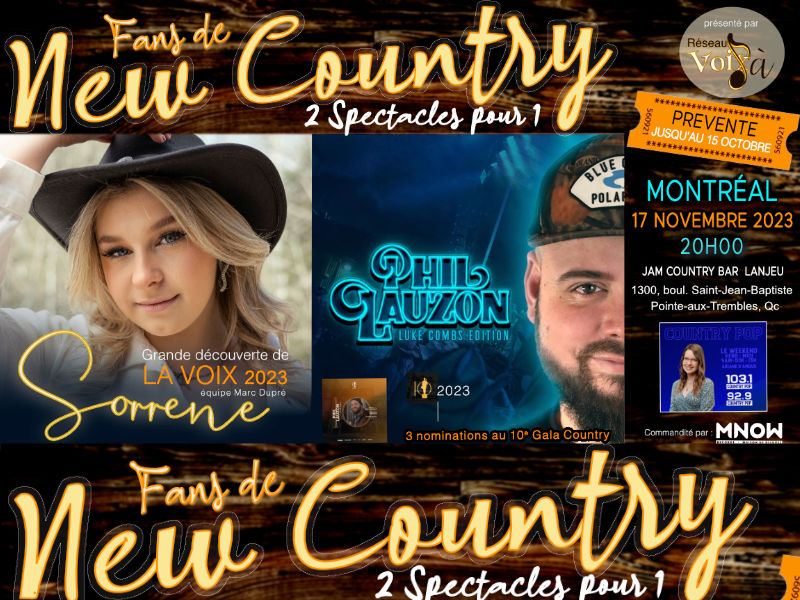 Sorrene de La voix 2023 sera accompagnée de ses 6 musiciens. Elle interprétera 2 nouvelles chansons originales et des reprises d’artistes qui marquent le monde du Rock New Country tels que: Maren Morris, Tennil Townes, Ingrid Andress, Jess Moskaluke, Carrie Underwood et plusieurs autres parmi son répertoire. Après ma prestation, voyez nul autre que Phil Lauzon (Lauréat Album de l'année - autre langue Gala Country 2023), la vedette de l’heure, l’étoile montante dans le New Country au Québec.